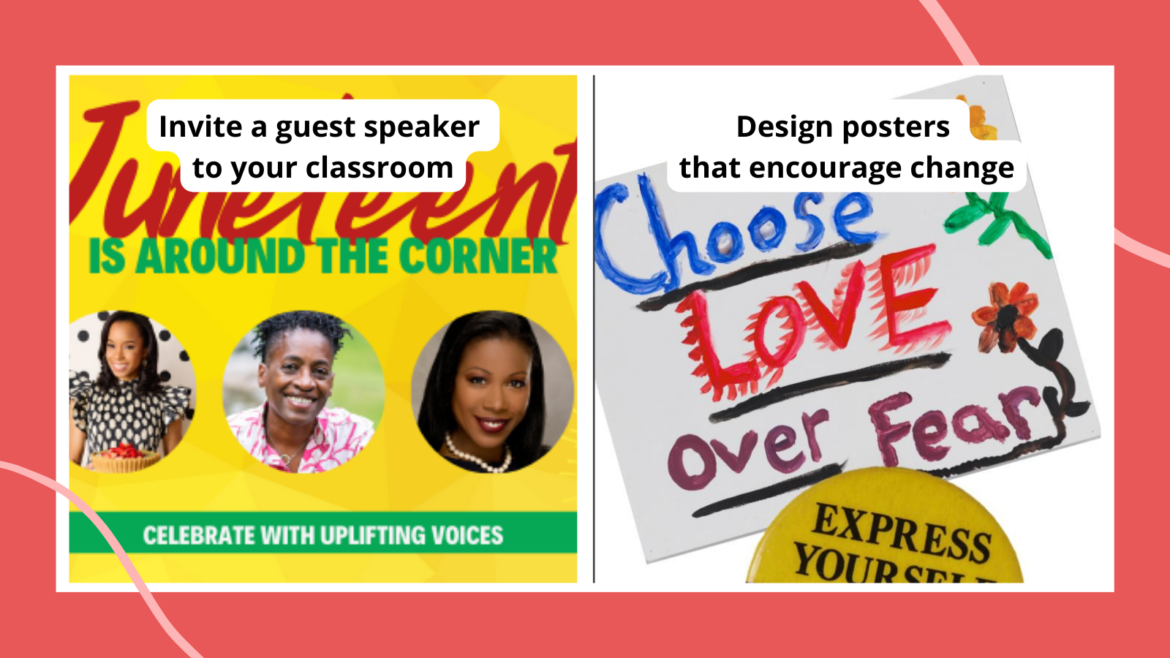 The National Museum of African American History & Culture has created a guide complete with Juneteenth activities, resources, and a book list to support students with celebrating and understanding this holiday. One activity asks students to create posters, pictures, or journal entries about changes they want to see in the world and then discuss how they can help make them happen.
