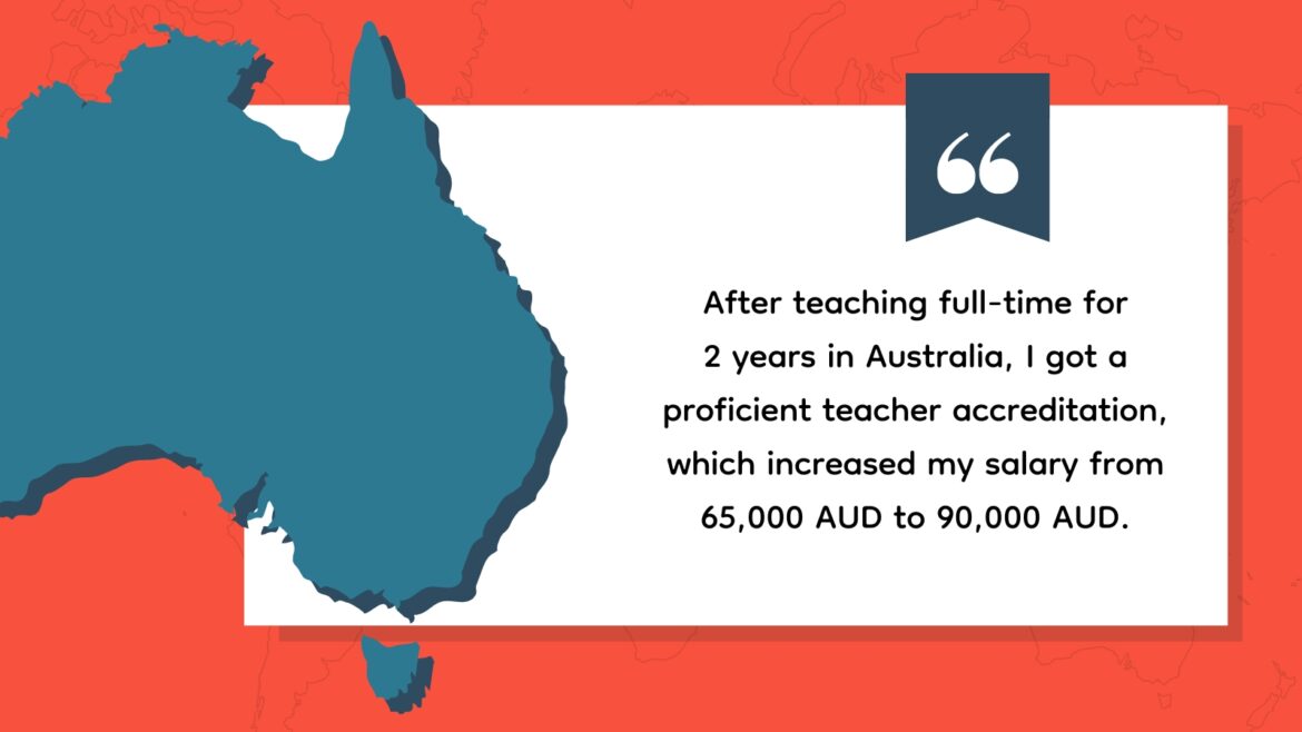 After living in Australia for a year, I applied for a permanent resident partner visa. Then I got my first full-time classroom job at $65,000 Australian dollars. After teaching full-time for two years in Australia, I got a proficient teacher accreditation, which bumped my salary up to $90,000AUD. Now, after teaching full-time in a private school, I’m at $115,000. I could complete a Highly Accomplished teaching accreditation, but it’s about two years’ work on my own time, and I have been told it requires a similar amount of work to a master’s, but I could get bumped up to $150,000.
