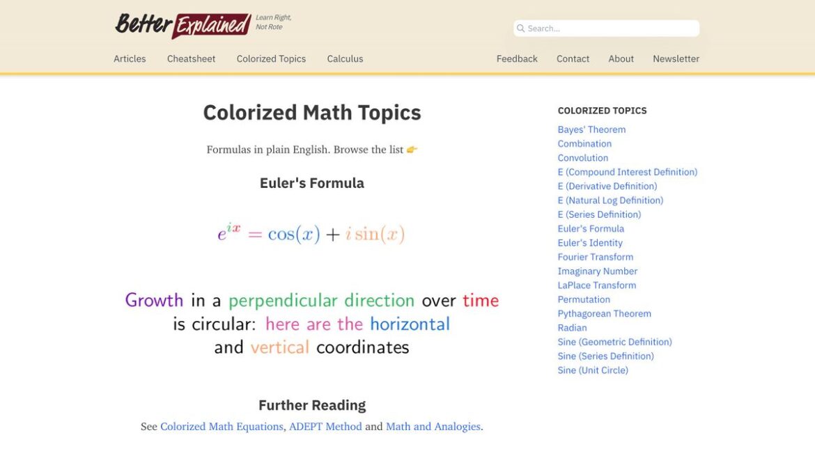 BetterExplained is very easy to use with a clear — if a little dated — layout to all the information. Articles are broken down into sections such as Calculus, Computer Science, Essays, Advanced Math, Algebra, Math Essentials, Exponents and Logs, Geometry, and more.