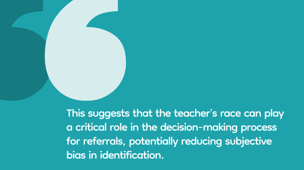 - Impact on disability categories with high discretion: The findings highlight a stronger relationship for disabilities that have a more discretionary component in their identification, such as specific learning disabilities. This suggests that the teacher’s race can play a critical role in the decision-making process for referrals, potentially reducing subjective bias in identification.