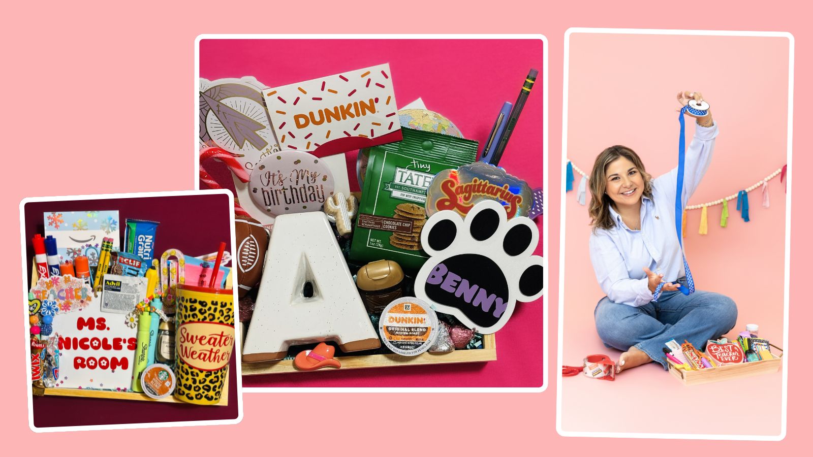 It usually starts with the teacher or event in mind. I gather information about their personality, interests, teaching style, and general taste. I then begin gathering items that are both fun and useful for the recipient. I love mixing practical supplies with little surprises that speak to each individual recipient.