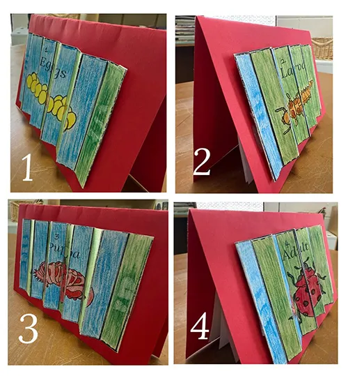Students can color two printed templates of the ladybug’s life cycle: template 1 should have images of stage 1 (eggs) and stage 2 (larvae); and template 2 should have images of stage 3 (the pupa) and stage 4 (adult ladybug). (Make sure the two templates are attached to each other. I like to stick both to a bi-folded sturdy cardstock using tape.)