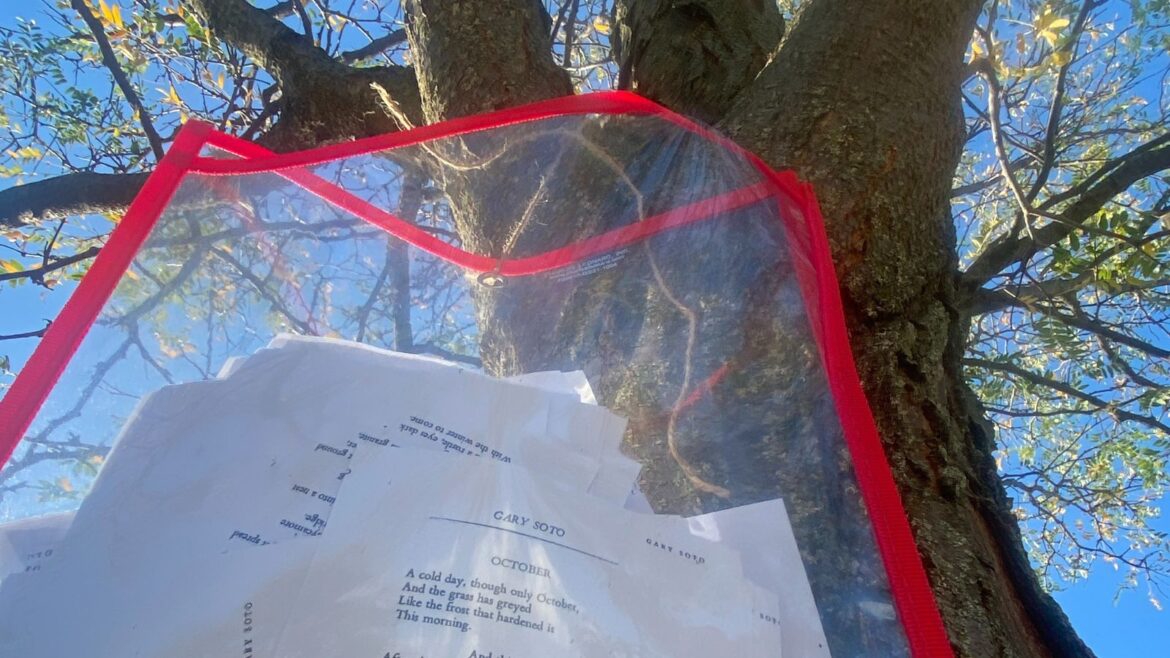 Attach each laminated page to tree limbs, fence posts, or walls using string, zip ties, or tape. Check visibility and distance. Keep them at eye level for the students. Allow for enough distance between each stop for movement and maybe even a little chatting. In fact, you could even include discussion questions about the poem or ways for students to respond with an activity.