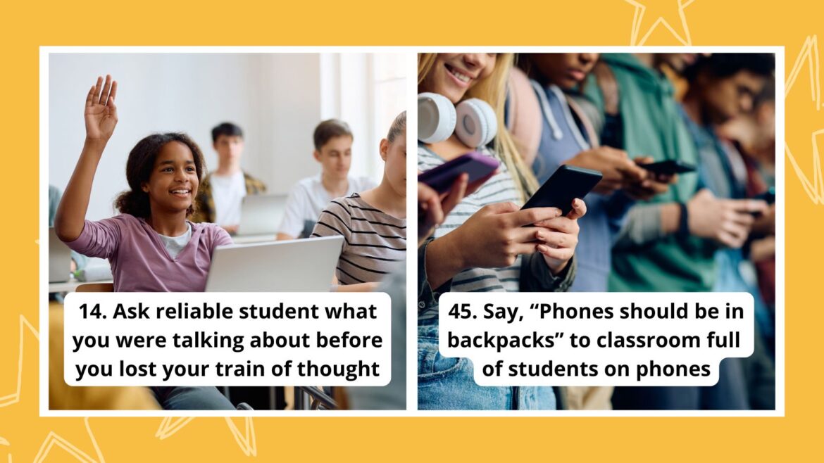 45. Say, “Cell phones should be off and in backpacks,” to your class full of students who walk in from the fire drill on their phones.