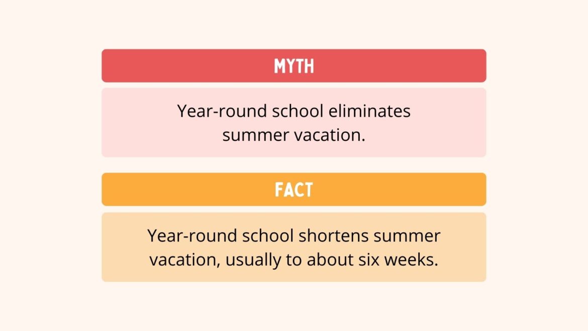 Myth! Year-round schools usually have around the same number of instructional days (most states require 180). They’re just more evenly distributed throughout the year. What a year-round calendar may provide is more frequent opportunities for remedial instruction during midyear breaks, but participation is usually optional.
