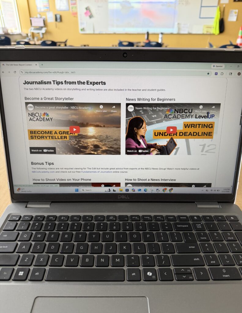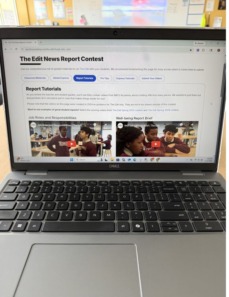 The Edit from NBCU Academy and Adobe is a student video news production contest for middle and high school classrooms where they research, script, film, and edit their own news segments. The program introduces the fundamentals of journalism and multimedia storytelling. It also includes detailed teacher and student guides, planning templates, and access to professional-quality Adobe editing tools and tutorials.