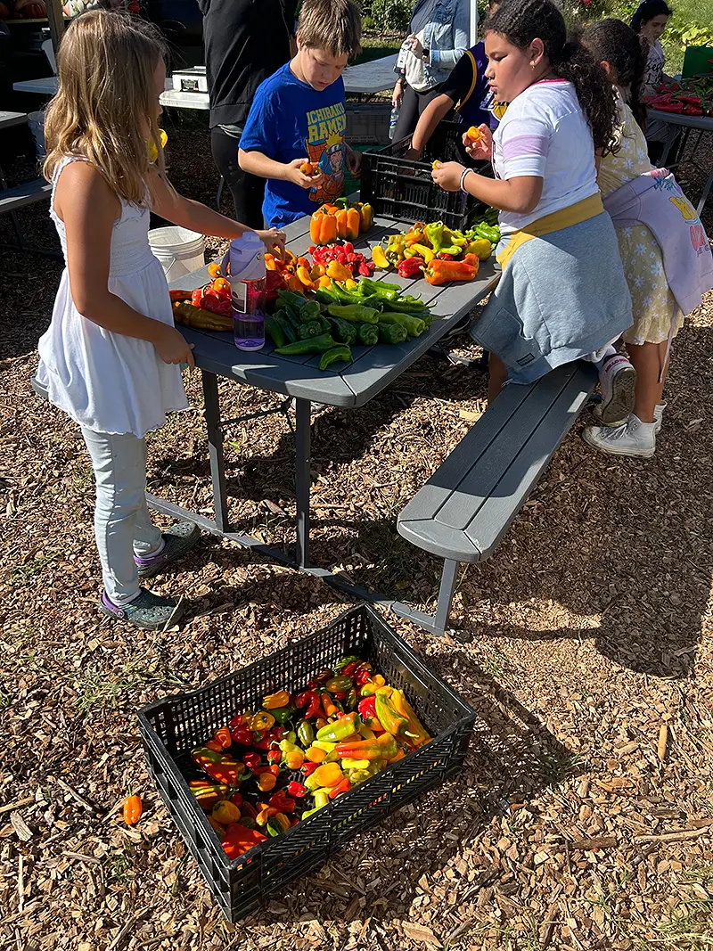 Jason focuses his attention on prepping the harvest station—not an easy task to organize for large numbers of 10-year-olds. Meanwhile, Danny gets to work setting up the day’s lessons, which include a game of hopscotch on the basketball court next to the farm, and a scavenger hunt in the outdoor classroom.