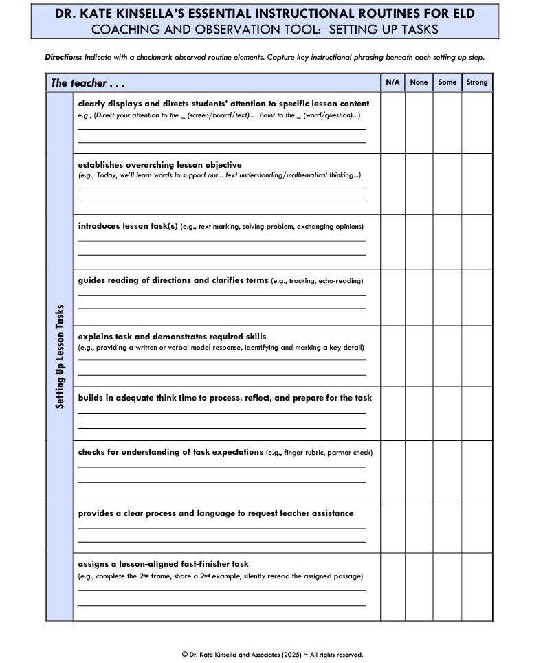Because effective task setup for multilingual learners is such an endemic instructional challenge, my associates and I make this a priority when preparing instructional resource specialists, classroom teachers, and administrators alike. Whether supporting English learners in a pull-out, co-teaching, or dedicated ELD context, K–12 educators must make every effort to get all students off to a confident start on focal lesson tasks. The following step-by step process is gleaned from a decade of dedicated and integrated ELD-focused research projects, professional development, and technical coaching across grade levels (HMH, 2025; Kinsella, 2018). While to some it may appear overly detailed, this is the level of instructional precision warranted when serving students who are dually identified or entering and emerging English learners.