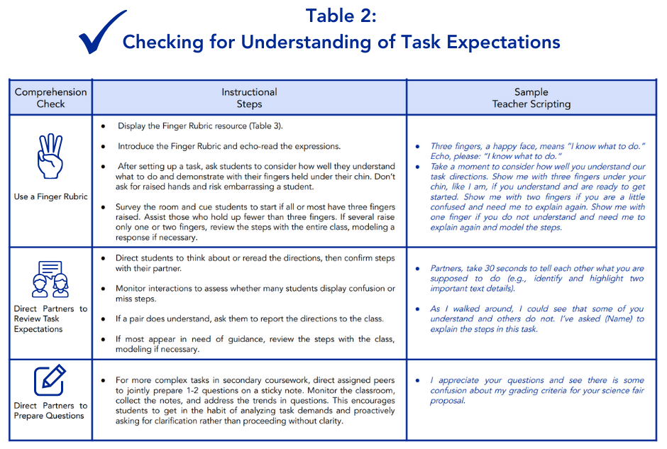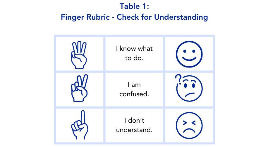 • Use one or two efficient and familiar methods to check whether students understand what you expect them to do. Display a poster prominently with a finger rubric or icons representing levels of understanding. (See Table 1: Finger Rubric.) Show me with your fingers how well you under stand what to do: 3) I understand; 2) I am a little confused; 1) I don’t understand. It looks like you are ready to ex change ideas. (See Table 3: Checking for Understanding of Task Expectations for more detailed guidance.)