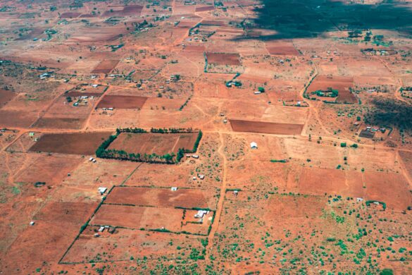 Aerial view of simple farms and family homes in the Maasai tribal area in the Great Rift Valley, Kenya during the drought of 2022.