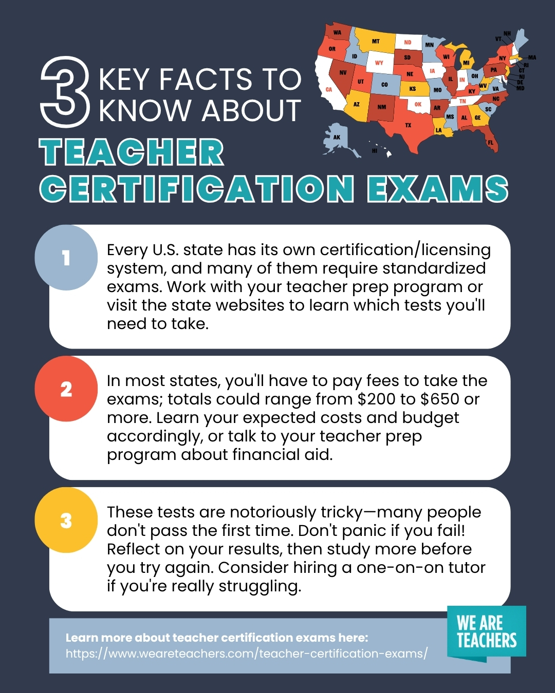 Every state has its own teacher certification requirements, many of which require standardized exams. If you’re enrolled in a teacher prep program in the state where you plan to teach, they’ll help you understand the local testing requirements. If you’re planning to teach in a different state after you graduate from your program, visit the individual state’s website (listed above) for all the details.