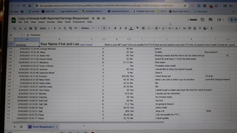 Every day, kids pay themselves a dollar. They use a Google spreadsheet I designed—it does all the math for them. They enter the date and mark T for tardy, P for present, or A for absent. If they’re absent, they don’t earn money. I wanted this to be all on them, not me.