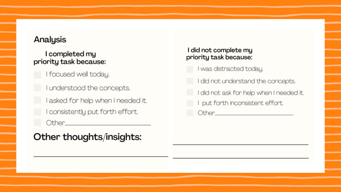- Enhanced reflection: Provide students with a structured self-reflection checklist to help them analyze their performance and understand the link between their actions and outcomes. Feel free to use the checklist Miss Saylor provided to the We Are Teachers team!