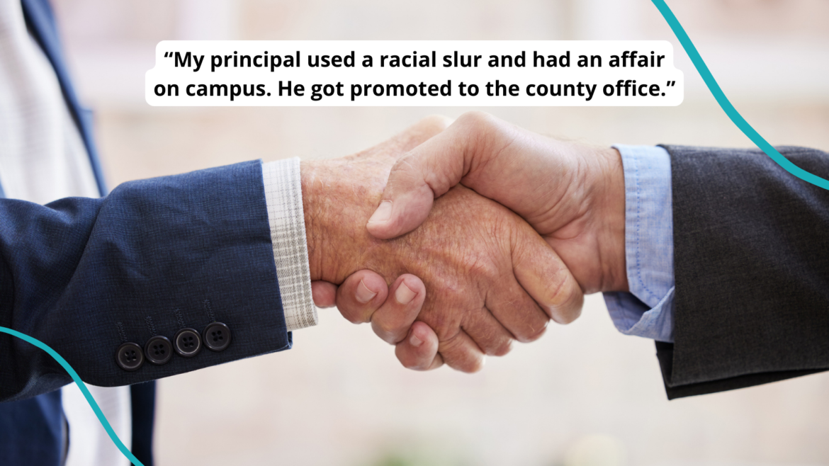 - “My principal used a racial slur and had an affair so he got promoted to the county office. Georgia.”
