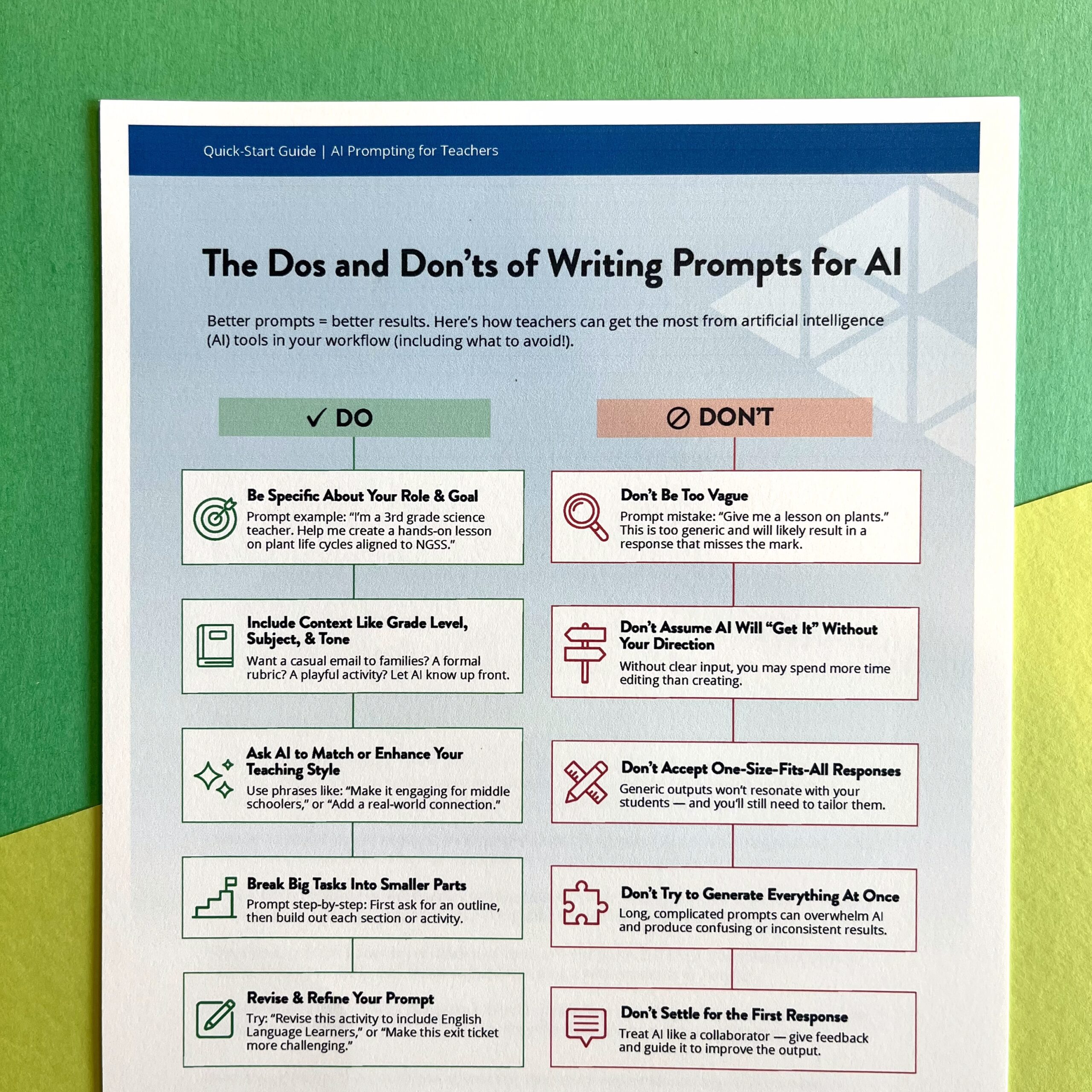 Not just for teachers (you may want to display this one for your students too), this super-helpful list provides tips on how to get the most out of your AI writing prompts. It will quickly become one of your classroom’s most frequently referenced AI tools.